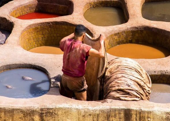 Ще се отбием първо до Кралския дворец със седемте златни порти, където ще слезем от автобуса и ще направим снимки отвън. Непосредствено до него ще посетим старият еврейски квартал наречен Мелах, създаден през 1438 г. После ще потеглим към хълма, на който е разположена една от старите наблюдателници на Фес, наречена Борш, от където ще се насладим на Медината от високо. След като приключим с пейзажите, ще посетим старата Медина с над 9 000 лабиринтни улички, която е най-голямата пешеходна зона в света - паметник на Юнеско. Ще влезем през главната порта Баб Божлю, за да можем да се пренесем векове назад и да усетим как са живеели и работели местните в миналото. Ще видим как се обработва и боядисва известната мароканска кожа, посещавайки една от най-старите им фабрики Шуара. Ще се отбием до площада Нежарине - мястото, където се свързват всички улички от Медината. След това ще посетим занаятчийско ателие-музей, където ще видим обработката на бронз, гравирането върху него на ръка от местен майстор, както и известните ръчно обработени лампи на Фес. Разбира се на това място ще имате време и възможност да си купите сувенир за спомен. Когато продължим с разходката ще минем покрай сградата на стария воден нощен часовник на Медината – Клепсидра, след което ще посетим красивото медресе Боу Инания. Ще имаме възможността да видим от вън първия университет в света създаден от една тунизийка – Фатима ал Фихрия. Ще видим отвън джамията, в която се намират тленните останки на създателя на Фес - Мулай Идрис (IX век). Фес е известен със своите текстилни ателиета, които ще посетим, за да се запознаем отблизо с традиционното облекло на мароканците. Ще имаме възможността да се облечем с тях и да си направим снимки за спомен, а който поиска може и да се спазари с местните продавачи, за да си купи нещо по желание (все пак отиваме към пустинята, където всички са облечени в традиционни дрехи и шалове)