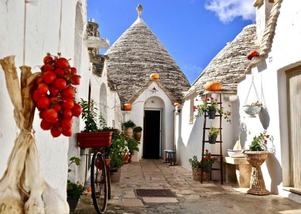 Отпътуване от хотела за Алберобело – посещение на „визитната картичка на Пулия“. Алберобело е град с толкова особено обаяние, че е трудно да се ориентирате в коя страна сте или на коя планета се намирате. Столицата на трулите сякаш Ви пренася в света на приказките. Трулите са малки бели къщички с конусовидни покриви. Градени без всякаква спойка, те са една от най-големите данъчни измами през средновековието. В близост до главния площад се намира църквата „Санта Лучия”, както и градския музей „Територио”. Музеят е направен от 10 трули обединени в една. В музея може да се види историята на създаването на трулите и как обитателите им са живеели в тях в миналото. Алберобело има и други по-малки музеи, които предлагат на туристите сувенири и почти всичко, което една селска къща произвежда. В цената е включена дегустация на домашно произведени ликьори и сладки.