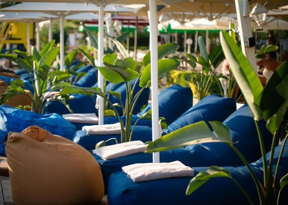 Собствен пясъчен плаж. Чадъри и шезлонги на плажа - безплатно.