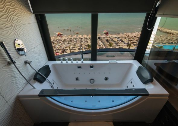 Собствен пясъчен плаж. Чадъри, шезлонги и плажни кърпи на плажа и басейна - безплатно.