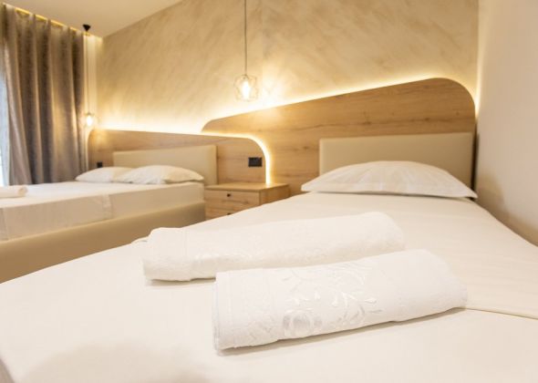 Хотелът се състои от основна и анекс сграда и разполага с 26 стаи, от които : 13 с изглед към морето и 13 с изглед към града. Всички стаи са оборудвани с климатик, телевизор, баня, минибар, балкон или тераса. Почистване на стаите - всеки ден.