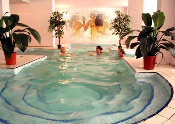 Предлага закрит и открит плувен басейн и голяма тераса за слънчеви бани с шезлонги.
