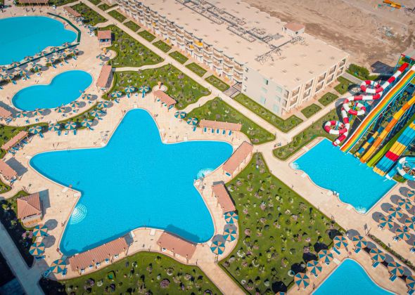 Основен ресторант,  2 а-ла-карт ресторанта – азиатски и рибен, 5 бара, дискотека, 5 открити басейна, аквапарк с 10 пързалки за възрастни и 14 пързалки за деца, СПА център, фитнес, конферетна зала, магазини, Wi-Fi (в лобито).