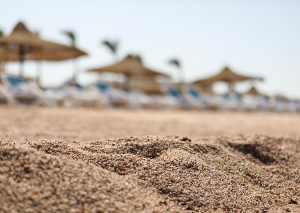 Собствен, пясъчен. Чадъри, шезлонги и матраци на плажа и при басейна - безплатно.