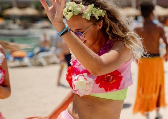 Собствен, пясъчен (лагуна) с дължина 300м. и коралов – чакълест с дължина 450 м. Чадъри, шезлонги и матраци на плажа и при басейна - безплатно.