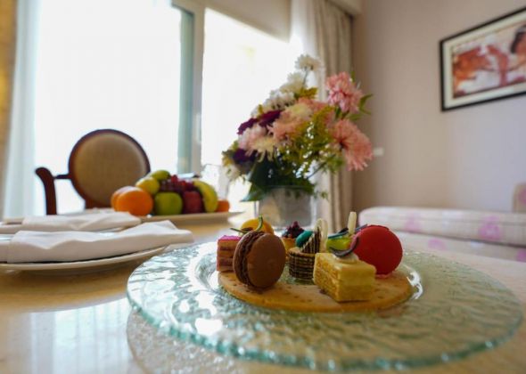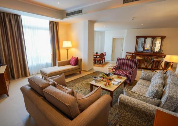 Хотелът разполага с общо 644 стаи, разположени в основна триетажна сграда и отделни двуетажни корпуса, от които 428 Classic room (45 м2), 87 Executive rooms (45 m2), 33 Family rooms (две помещения, разделени с плъзгаща врата 52 м2), 6 superior rooms (56 m2). Всички стаи са оборудвани с климатик, телевизор, телефон, баня с душ, сешоар, меню на възглавници, сет за кафе/чай, мини-бар (зарежда се ежедневно - безплатно), сейф (безплатно). Почистване на стаите и смяна на кърпите - всеки ден, смяна на спално бельо – 3 пъти в седмицата. Комплимент при пристигане - безплатно зареждане с кошница плодове и сладки.