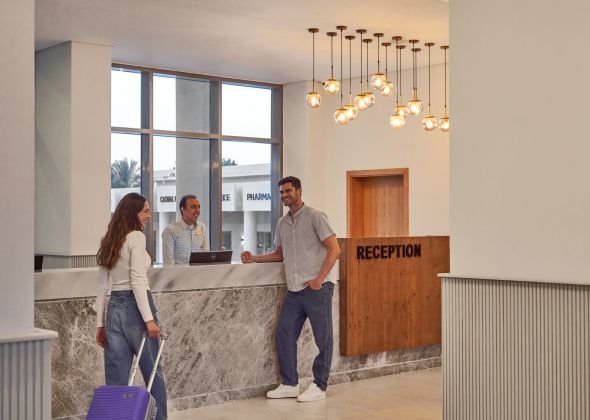 Собствен, пясъчно – чакълест с коралов риф, разполага и с платформа. Чадъри, шезлонги и матраци на плажа и при басейна - безплатно. Плажни кърпи – безплатно.