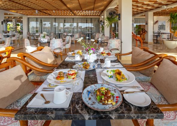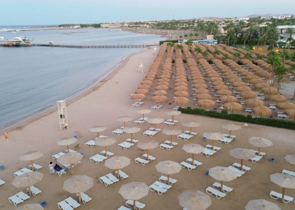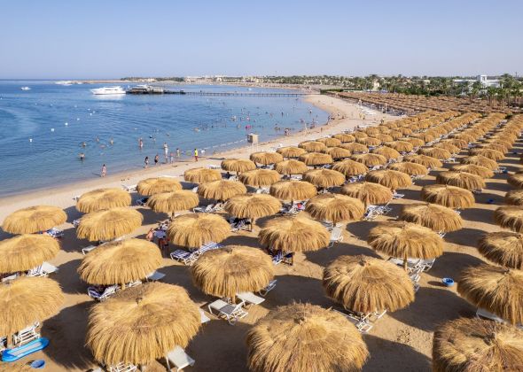 Собствен, пясъчно – чакълест с коралов риф, понтон и частна марина. Чадъри, шезлонги и матраци на плажа и при басейна - безплатно. Плажни кърпи – безплатно.