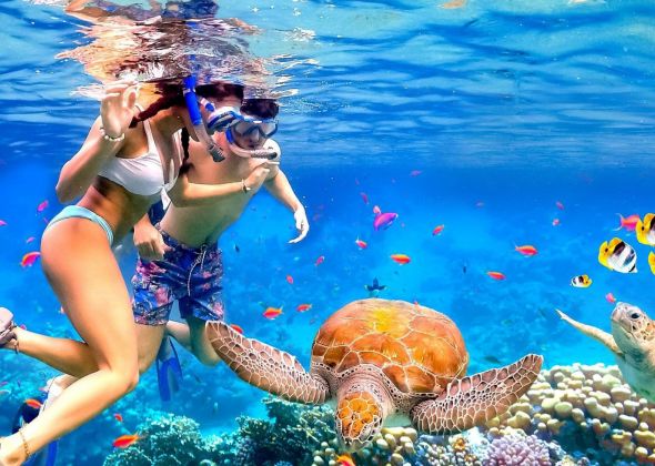 Разходка с яхта с две спирки за плуване на едно от най-красивите места (Голямата лагуна). Ще се насладите на разходка с камили. След това ви очаква вълнуващо каране на АТВ (квадроцикли) през живописен каньон с цветни скали. Накрая ще се отправите към бедуински оазис.