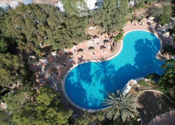- Открит басейн с шезлонги и чадъри