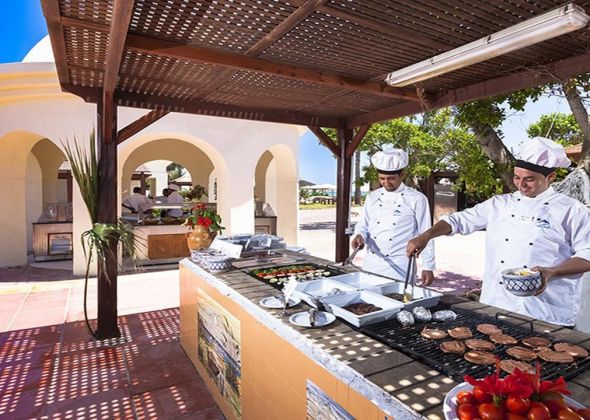 Изхранването е закуска, обяд и вечеря на блок маса с местна и интернационална кухня. Има възможност и за късна континентална закуска на плажа от 10.00 ч. Следобедна закуска се сервира от 15.00 ч. до 17.00 ч. Алкохолни и безалкохолни напитки се сервират от 10.00 ч до 0.00 ч.