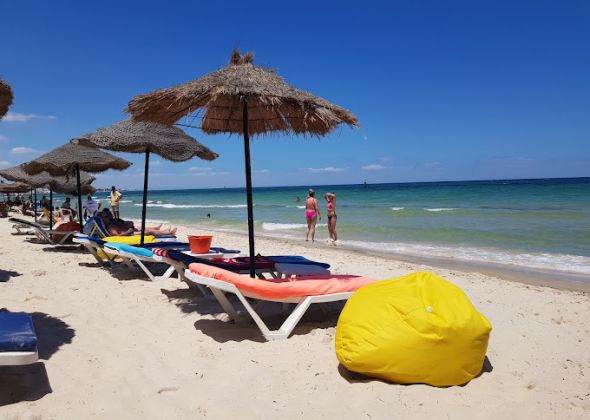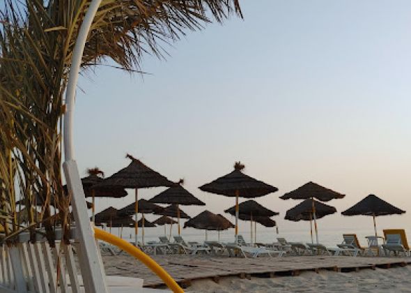 Собствен, пясъчен плаж, с лек наклон, пред хотела. Чадъри и шезлонги на плажа и при басейна - безплатно. Плажни кърпи - срещу депозит.
