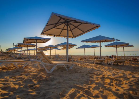 Собствен, пясъчен. Чадъри, шезлонги, матраци на плажа и басейна - безплатно, плажни кърпи - безплатно, срещу депозит.