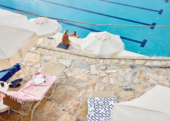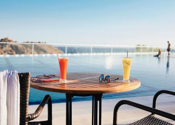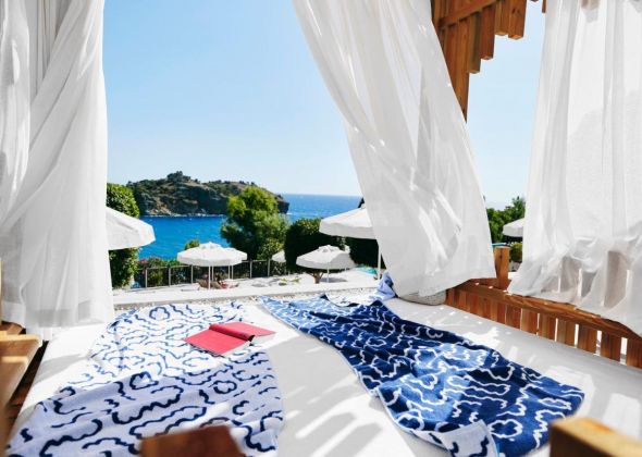 Собствен, пясъчен плаж с ширина 180 м, удостоен със син флаг. Чадъри и шезлонги на плажа и при басейна - безплатно.