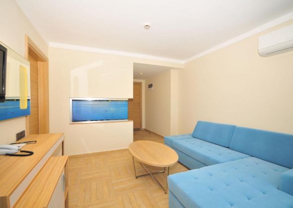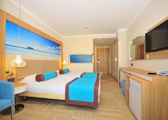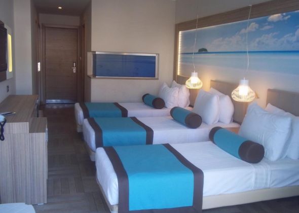 Хотелът разполага с общо 437 стаи, разпределени в 5 блока, от които Standard room с изглед градина или с изглед море (21 -25 м2), Family room (38-45 м2), Juniore suite (31м2). Всички стаи са оборудвани с климатик, телевизор, телефон, баня с вана/душ, сешоар, мини бар (вода при пристигане), сет за чай/кафе, сейф (платен), балкон, WI-FI интернет. Почистване на стаите – всеки ден, смяна на спалното бельо и кърпите – 3 пъти в седмицата.
