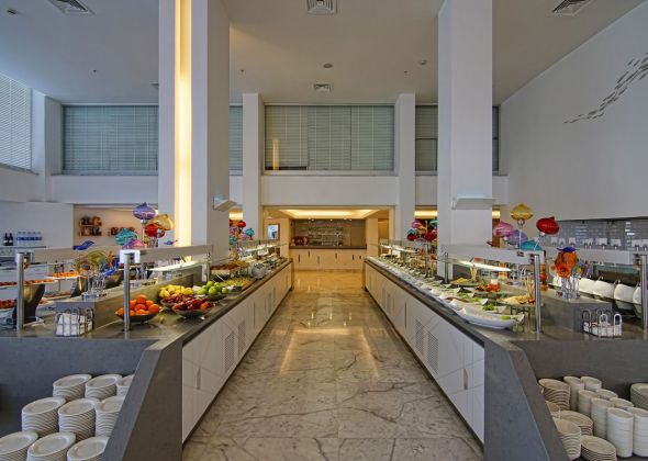 Основен ресторант, 2 а-ла-карт ресторанта (рибен и стек- срещу заплащане/ с предварителна резервация, съгласно концепцията на хотела/ 1 безплатно посещение на рибния ресторант при минимум 5 нощувки), сладкарница, 4 бара (един от които работи 24 часа), Starbucks Corner, Nespresso Corner, външен и вътрешен басейн, детски аква парк, СПА център, фитнес, лека анимация, тенис корт, конферентни зали, интернет, паркинг.