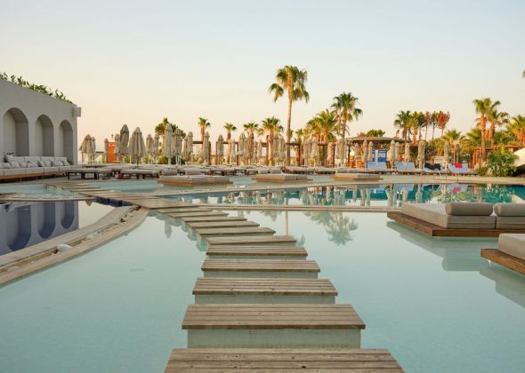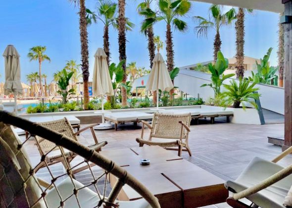 Собствен,, пясъчен сдължина 100 м. и платформа, на която е разположен Mocha Beach Club с кабани (срещу заплащане). Чадъри, шезлонги и плажни кърпи на плажа и при басейна -безплатно.