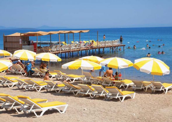 Собствен, пясъчен на 400 м от хотела. Чадъри, шезлонги и плажни кърпи на плажа и при басейна – безплатно. Два пъти дневно функционира безплатен шатъл от и до плажа.
