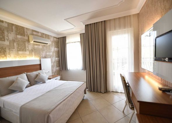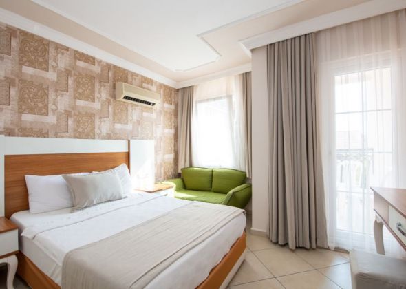 Хотелът се състои от 7 блока на по 3 етажа и разполага с общо 132 помщения за настаняване - стандартни стаи (с гледка море или градина) и  фамилни стаи. Всички те са оборудвани с климатик, телевизор, телефон, минибар (заредежда се в деня на настаняване с минерална вода и безалкохолни напитки). Следващите дни се допълва само с минерална вода), сейф, баня с душ кабина, сешоар, балкон. Почистване на стаите - всеки ден, смяна на бельото - два пъти в седмицата.