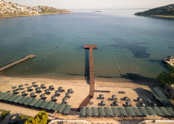 Собствен, пясъчно - чакълест. Чадъри и шезлонги на плажа и при басейна – безплатно. Плажни кърпи срещу депозит.