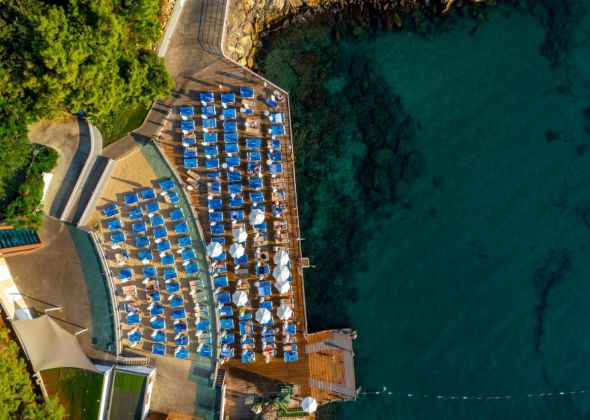 Собствен – платформа на 3 нива. Чадъри, шезлонги и матраци на плажа и при басейна – безплатно. Плажни кърпи – безплатно.