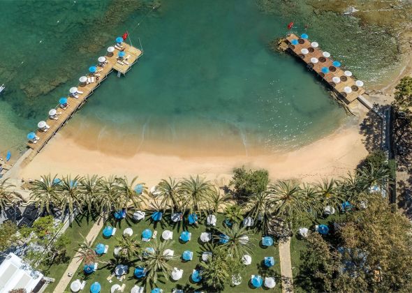 Собствен, пясъчен залив с дължина 200 м., 2 кея. Чадъри, шезлонги и плажни кърпи на плажа и при басейна - безплатно.