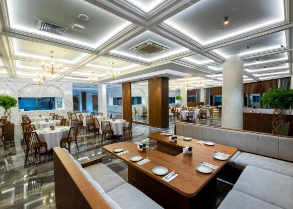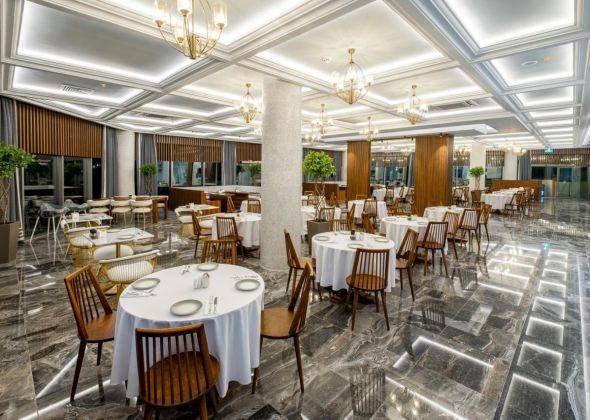 1 основен ресторант, а-ла-карт ресторант BISTRO TERRAZZA (24/7, интернационална кухня, без доплащане), ресторант THE WHITE LOUNGE (интернационална кухня, с предварителна резервация), сладкарница, 3 бара, 2 отрики и 1 закрит басейн, 4 водни пързалки, СПА център, фитнес, конферентна зала.