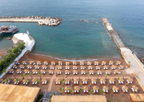 Собствен, пясъчен, платформа. Чадъри, шезлонги, матраци и плажни кърпи на плажа и при басейна - безплатно.