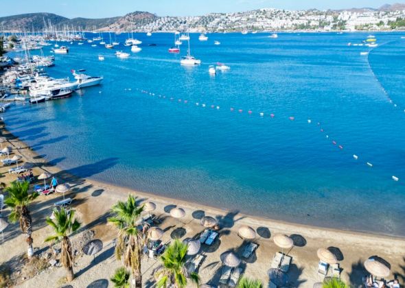 Собствен, пясъчно - чакълест. Чадъри, шезлонги и плажни кърпи на плажа и при басейна - безплатно.