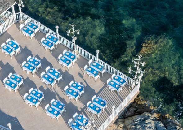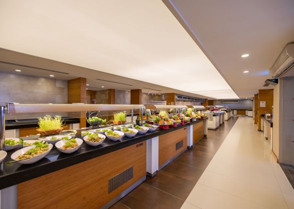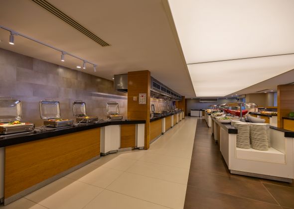 Основен ресторант, 2 а-ла-карт ресторанта (рибен и италиански - 1 безплатно посещение на 1 от ресторантите при минимум 7 нощувки, от 01.05.2026 - 30.09.2026), сладкарница, 3 бара, 3 открити басейна, 2 водни пързлки, СПА център, дискотека, магазини, паркинг.