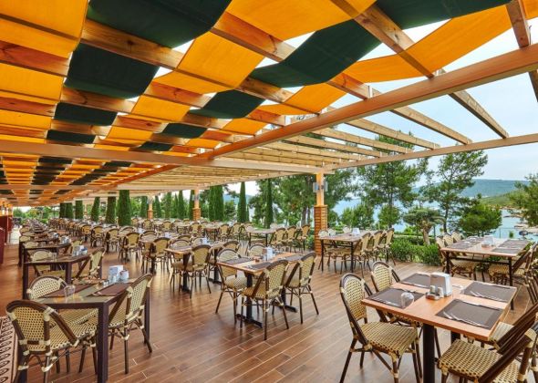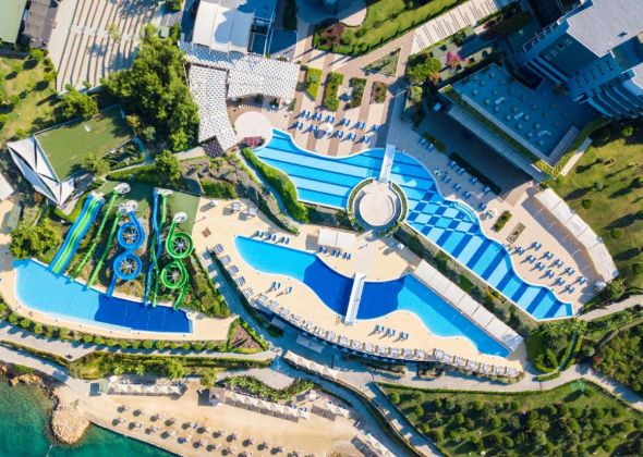 Основен ресторант PINA с диетичен, вегетариански и детски кът; 5 а-ла-карт ресторанта (турски MARDIN, италиански PULCINELLA, тепаняки SAKURA - с предварителна резервация, 4 снек ресторанта; 12 бара, сладкарница, 2 открити басейна, 1 закрит басейн, аква парк с 10 водни пързалки, амфитеатър, СПА център, дискотека, магазини, 9 конферентни зали, паркинг. На плажа има общо 16 кабани, които могат да се наемат срещу допълнително заплащане, с включен сервиз.