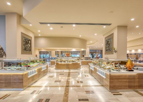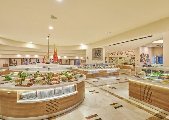 Основен ресторант PINA с диетичен, вегетариански и детски кът; 5 а-ла-карт ресторанта (турски MARDIN, гръцки MYLOS, средиземноморски VIRA, италиански PULCINELLA, тепаняки SAKURA - с предварителна резервация, Club Azure/ 4 снек ресторанта (Pina, Mylos, Vira, Sunrise); 12 бара (Sunset Lobby Bar, Sunris Bar, Vira Event Bar, Pool bar, Sisha Lounge, Mylos Bar, Sakura Bar, Pulcinella Bar, Club Azure/ Beach Bar, Disco Bar), Starbucks, сладкарница, 2 открити басейна, 1 закрит басейн, аква парк с 10 водни пързалки, амфитеатър, СПА център, дискотека, магазини, 9 конферентни зали, паркинг. На плажа има общо 16 кабани, които могат да се наемат срещу допълнително заплащане, с включен сервиз.