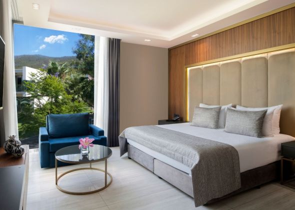 Стаи в основна сграда (Main Building): Superior Room Land (1 спалня, единично легло, 1 баня – 55 м²), Corner Deluxe Room Land View (1 спалня, едичино легло, 1 баня, гардеробно помещение – 65 м²), Superior Room Sea View (1 спалня, едичино легло, 1 баня – 55 м²), Family Suit Land (2 спални, 1 баня – 75 м²), Family Suit Sea View (2 спални, 1 баня – 75 м²).