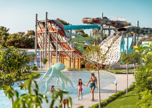 Основен ресторант, 7 а-ла-карт ресторанта (рибен, турски, италиански - 1 безплатно посещение на 1 от ресторантите при минимум 7 нощувки, световна кухня 7/24, азиатски, гръцки - срещу заплащане, VIP ресторант на вилите, сладкарница, 4 бара, 7 открити басейна,голям аквапарк, приключенски парк, кино, амфитеатър, СПА център, дискотека, магазини, 3 конферентни зали, паркинг.