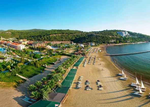 Намира се на 65 км от летище Измир, на 130 км от летище Милас, на 8 км от центъра на Кушадасъ, на брега на морето. Изграждането на комплекса започва през 2002 г. като в днешния си вид е завършен през 2006 г. реновиран 2022/2023. Разположен на обща площ от 85 000 м². Хотелът е удостоен със сертификат "Зелена звезда" за опазване на околната среда.