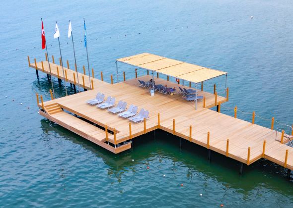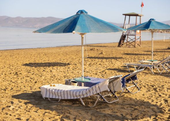 Собствен, пясъчен с дължина 300 м, притежаващ сертификат "Син флаг" и кей със 150 м дължина. Чадъри, шезлонги, матраци и плажни кърпи на плажа и при басейна - безплатно.