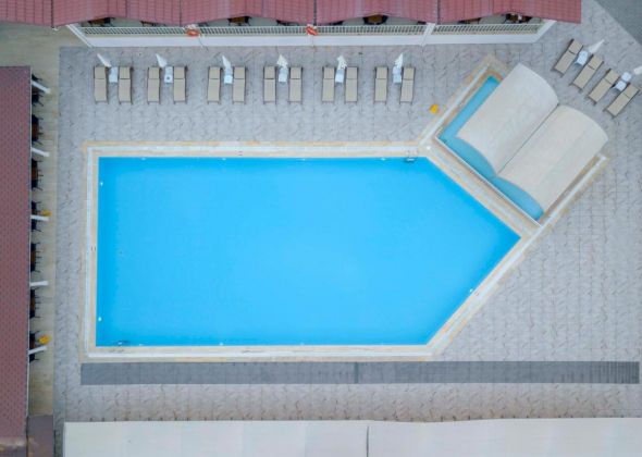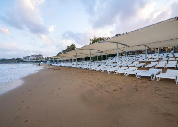 Собствен, пясъчно-чакълест. Чадъри, шезлонги и плажни кърпи на басейна и плажа - безплатно. Плажни хавлии - с депозит.