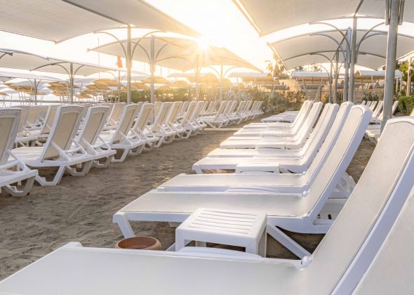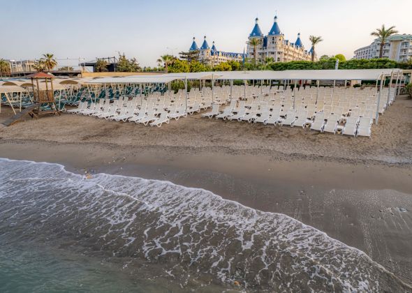 Собствен, пясъчно - чакълест. До плажа се стига посредством подземен тунел. Чадъри, шезлонги и плажни кърпи на плажа и при басейна – безплатно.