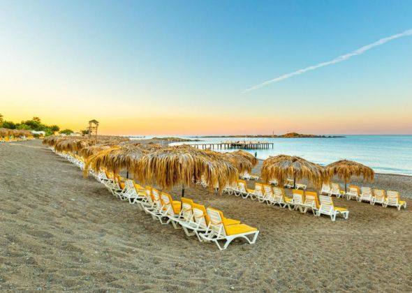 Собствен, пясъчно-чакълест с дължина на плажната ивица 350 м, платформа. Чадъри и шезлонги на плажа и при басейна - безплатно. Плажни кърпи – срещу депозит.