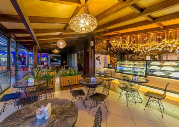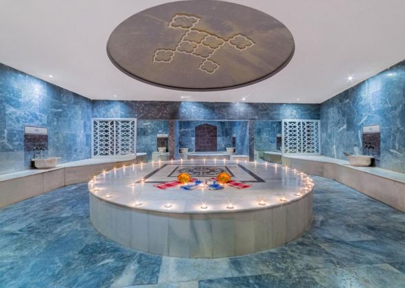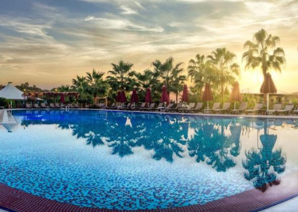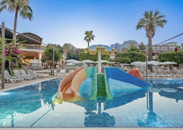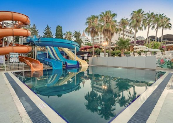 Основен ресторант,  снек бар, гюзлеме, сладкарница, 4 бара, 2 открити басейна, водни пързалки (общ достъп с хотел Justiniano Club Alanya), СПА център, магазини, конферентна зала.