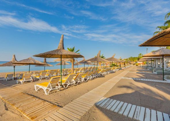 Собствен, пясъчно-чакълест. Чадъри, шезлонги, матраци и кърпи на плажа и при басейна - безплатно.