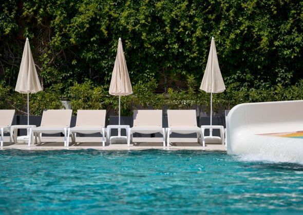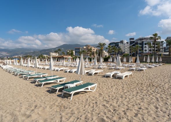 Собствен плаж, на 250 м. от хотела, пясъчно - чакълест. Чадъри, шезлонги и кърпи на плажа и при басейна – безплатно