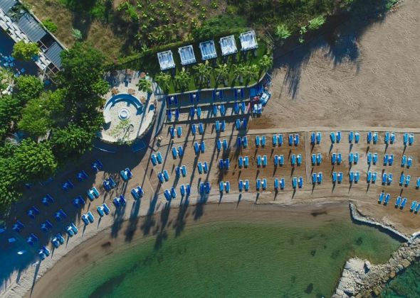 Собствен, пясъчно-чакълест. Чадъри и шезлонги на плажа и при басейна - безплатно. Плажни кърпи – срещу депозит.
