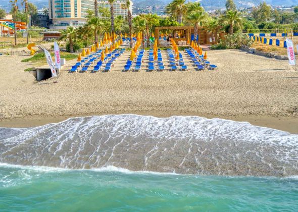 Собствен, на 500 м от хотела, пясъчно - чакълест. До плажа се стига посредством подземен тунел, предлага се и безплатен шатъл бус. Чадъри, шезлонги и плажни кърпи на плажа и при басейна – безплатно.