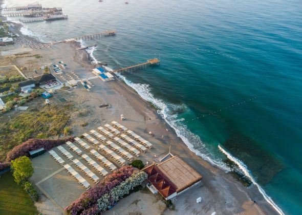 Собствен, чакълест. Чадъри и шезлонги на плажа и при басейна - безплатно.