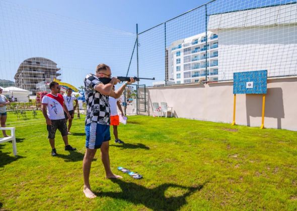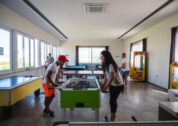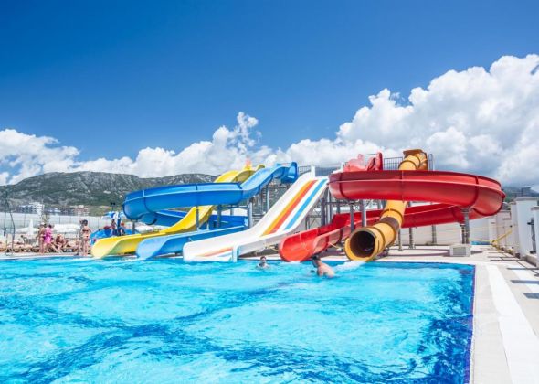 За децата: 2 открити детски басейна и 1 закрит, детска площадка, мини клуб (4-12 г), рисуване на лица, форми от балони, мини диско, детска анимация.