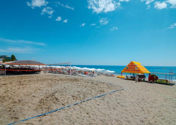 Собствен, пясъчно – чакълест на 150 м от хотела, чрез подлез. Чадъри, шезлонги и плажни кърпи на плажа и при басейна – безплатно.