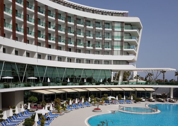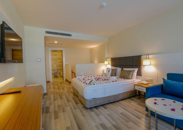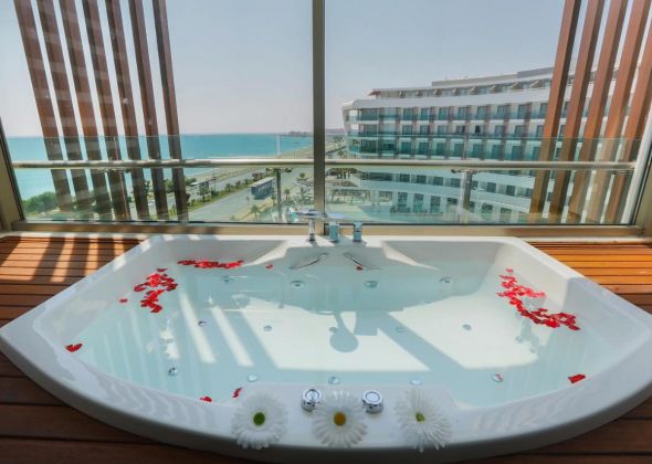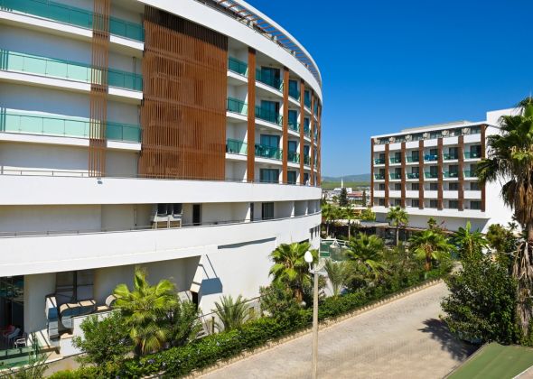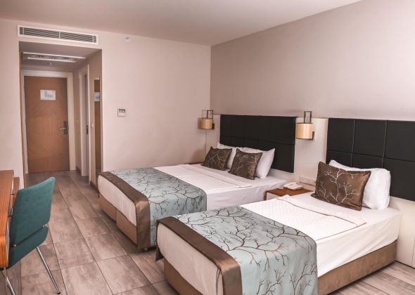 Стаи Main Building: 244 Hotel Standard sea view room (изглед море - 28 м2), Hotel Standard side sea view room (частичен изглед море - 28 м2), Hotel Standard land view room (изглед суша - 28 м2), 15 Dublex room (на 2 етажа - 2 спални, 2 бани, 1 диван - 56 м2), 7 Deluxe suite room (1 спалня, хол, 1 баня + джакузи - 57 м2), 4 Suite room (1 спалня + диван, 1 баня – 50 м2), 9 Large Standard room (32 м2).