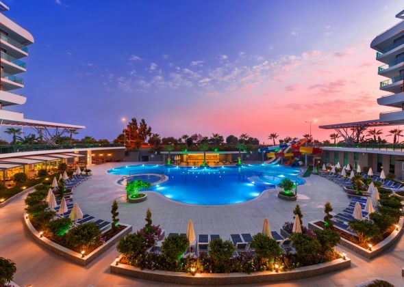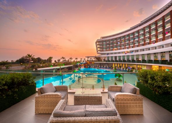 Основен ресторант, 1 а-ла-карт ресторант (рибен/турски – 1 безплатно посещение при минимум 7 нощувки), снек ресторант, сладкарница, 5 бара, 2 открити и 1 закрит басейн, аквапарк, амфитеатър, СПА център, 2 конферентни зали.
