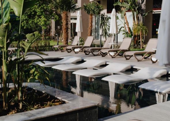 Собствен – чакълест. Чадъри, кърпи и шезлонги на плажа и на басейна – безплатно.